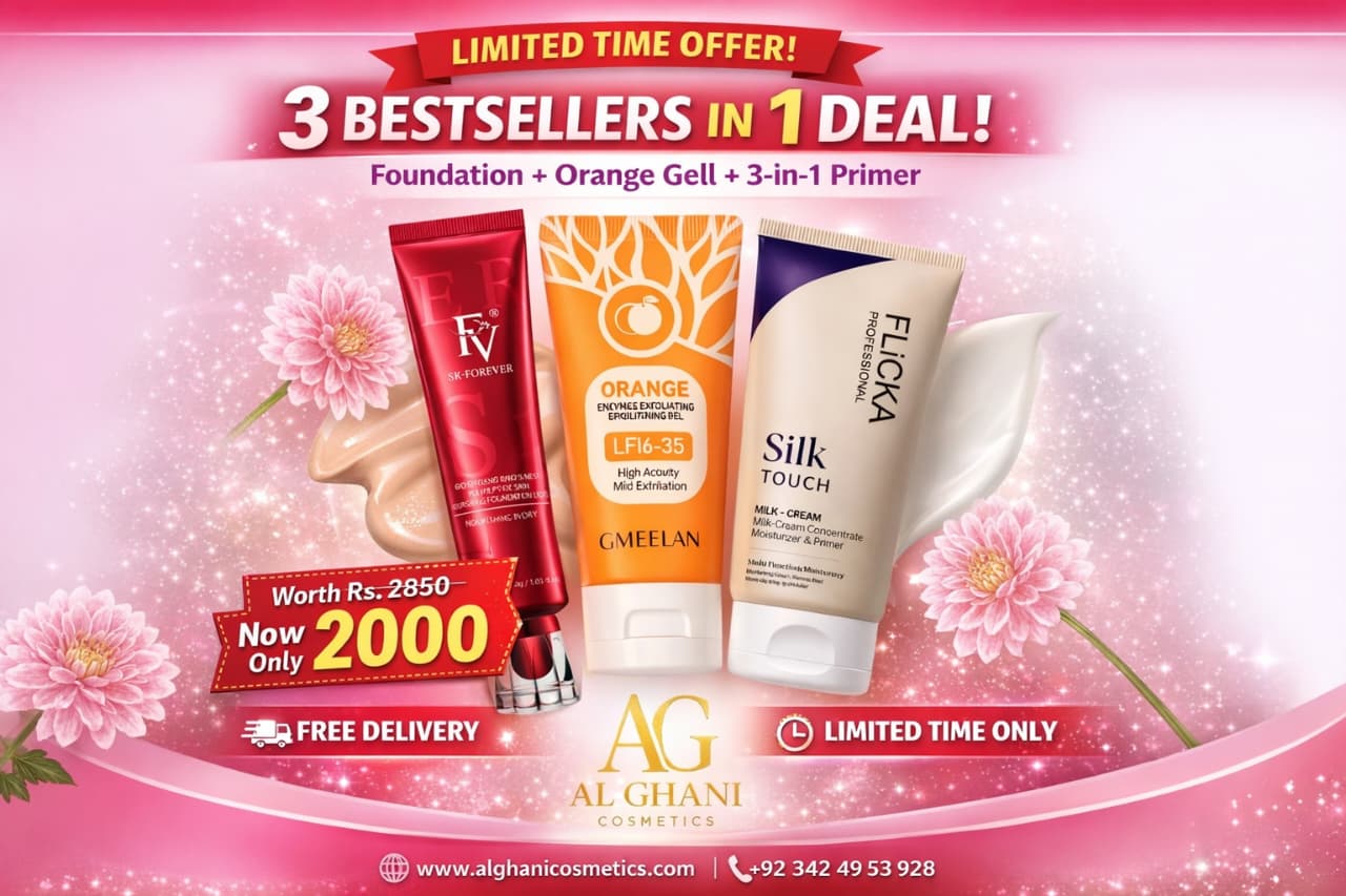 Al Ghani Cosmetics brings you an exclusive 3-in-1 Beauty Offer specially designed for girls who want smooth, radiant and long-lasting makeup at an affordable price in Pakistan.
