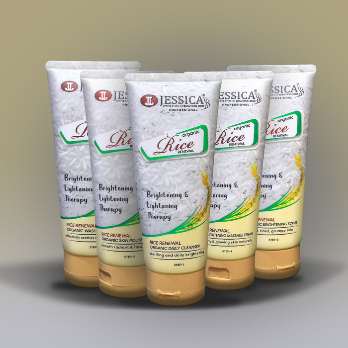 Achieve radiant, hydrated, and smooth skin with Jessica Rice Organic Facial Kit Pack of 5. Five-step care with rice extracts deeply nourishes, brightens, and improves skin texture for a natural glow.